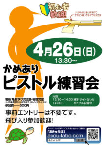 最終日となる4/26には、亀有学び交流館にて記録会も開催します。事前予約不要・飛び入り参加歓迎! レンタルガンもありますので「未経験だけれど、どんなもんなんだろう」って思ってる方も歓迎です、お待ちしてます!