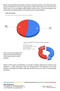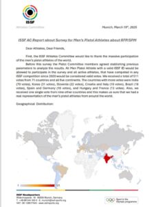 - ISSFの現役射撃選手による投票結果……ラピッドファイアの存続に賛成205票(53.5%)に対し、反対178票(46.5%)でした。ISSFの現役・非現役射撃選手全体では、ラピッドファイアに反対263票(51.4%)に対し、反対248票(48.6%)でした。