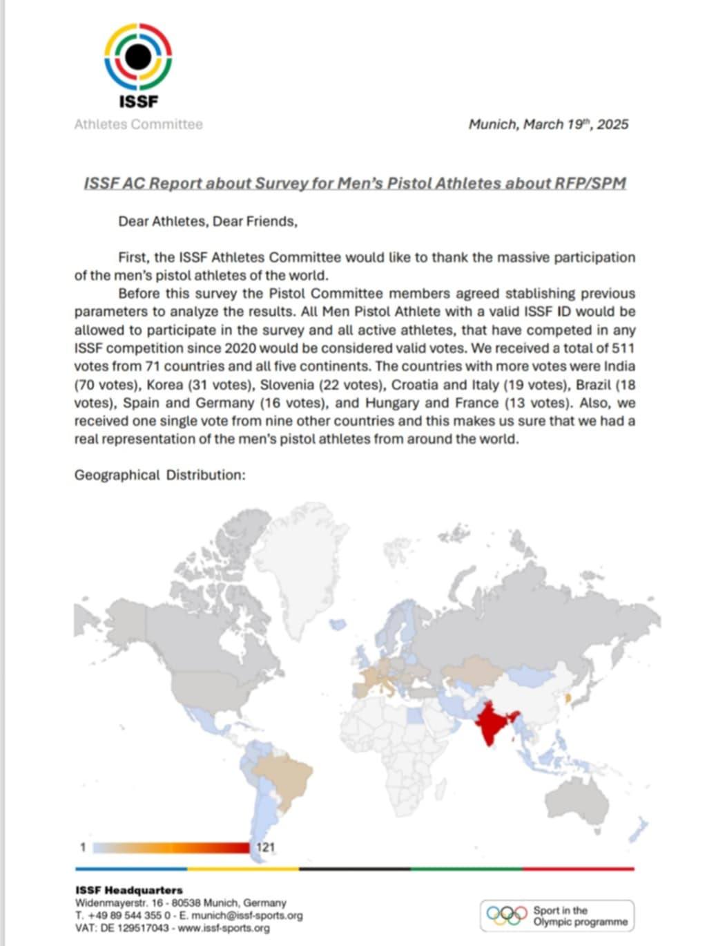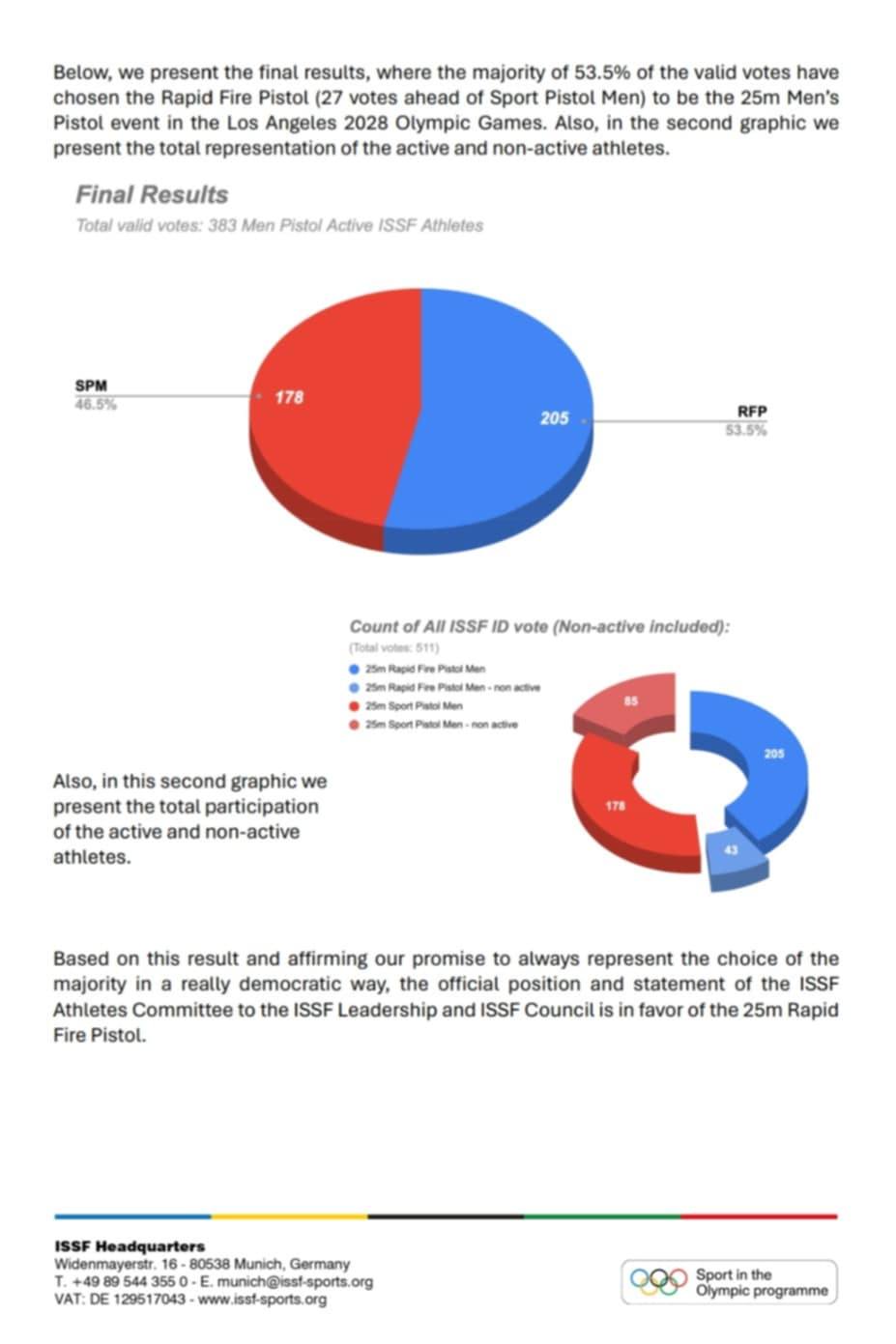 - ISSFの現役射撃選手による投票結果……ラピッドファイアの存続に賛成205票(53.5%)に対し、反対178票(46.5%)でした。ISSFの現役・非現役射撃選手全体では、ラピッドファイアに反対263票(51.4%)に対し、反対248票(48.6%)でした。